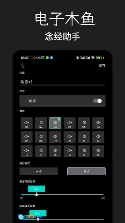 2、提供多种木鱼音色供选择,支持自定义悬浮文字,像 “功德 + 1”“烦恼 - 1” 等文字都能设置。