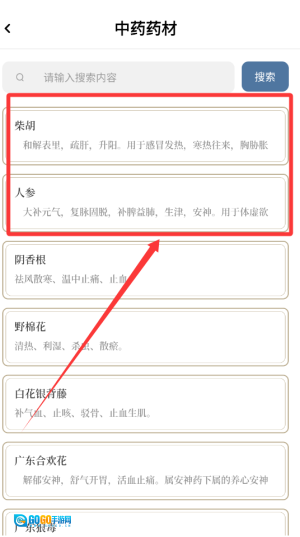 1、通过首页搜索框输入药材名称或方剂关键词,快速获取对应百科内容,包含性味归经、功效主治及经典出处等详细信息。