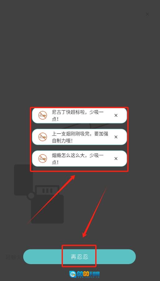 2、会弹出三个警示吸烟危害的提示牌,关闭这些提示牌后,接着点击“再忍忍”按钮。