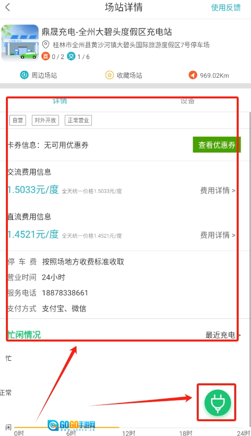 3、进入充电站页面后,仔细查看费用详情,要是确定在这里充电,直接点击页面右下方的插头按钮就行。