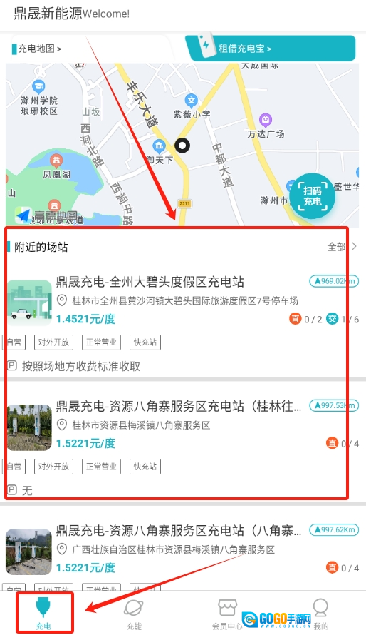 2、成功登录软件后进入首页,在展示的众多充电站里,点击任意一个你计划前往的充电站。