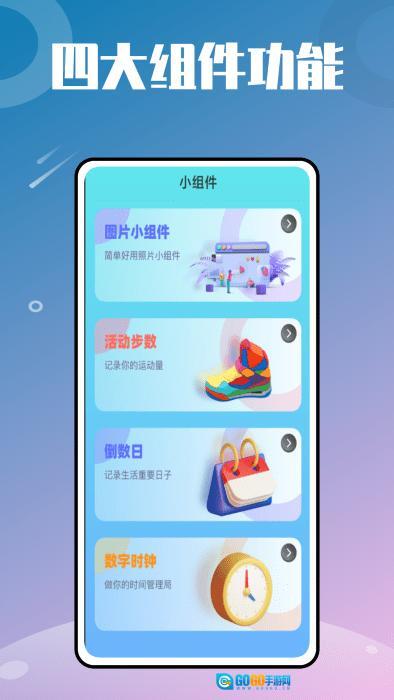1、全能组件包含图片展示、运动步数统计、倒数日提醒等功能,能够自由布局桌面,打造出个性化的手机界面。