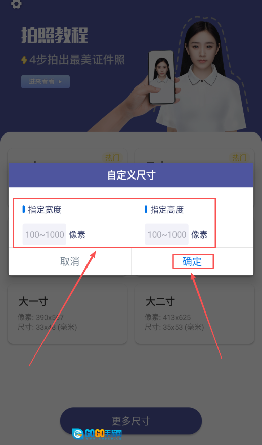 4、选择自定义尺寸后,在弹出的参数设置界面中,分别输入证件照需要的宽度和高度数值,确认数值无误后点击确定按钮完成设置。