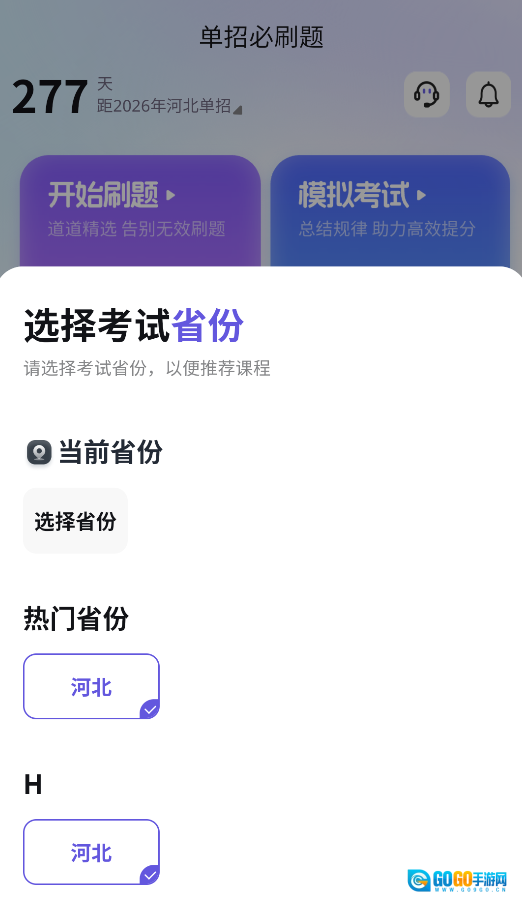 1、启动后,首先选择所在省份,系统将自动匹配当地单招考试大纲和真题库。