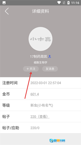 4、进入用户详情页面后,点击【+关注】按钮,就能完成对该用户的关注操作。
