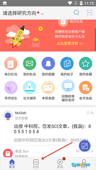 1、点击底部【社区】按钮,进入社区功能页面。