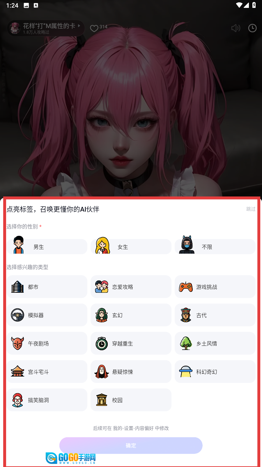 1、在初始页面选择性别(男生/女生/不限)与兴趣类型,点击【确定】按钮以点亮对应标签。