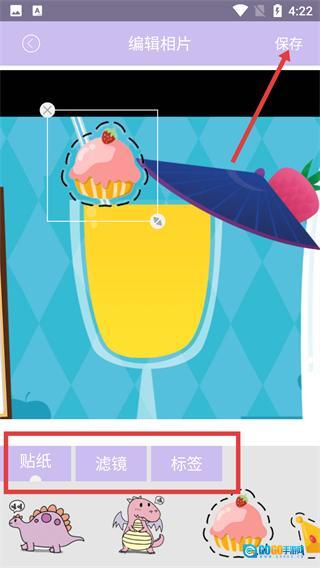 3、进入【编辑相片】页面后,能借助【贴纸】【滤镜】【标签】功能对图片进行装饰,编辑好之后点击右上角的【保存】按钮即可。