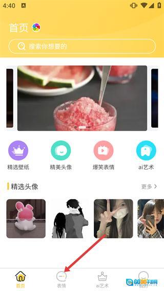 进入软件后,先查看【首页】界面,可借助顶部的搜索栏查找所需内容,点击【表情】功能入口即可使用该功能。