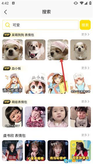 3、在【搜索】页面输入【可爱】这类关键词,系统会呈现【呆萌狗狗表情包】【血小板】之类的分类,点击“更多”按钮即可浏览所有相关内容。