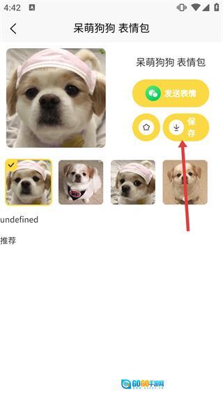 4、进入【呆萌狗狗表情包】的详情页面后,既可以点击【发送表情】按钮进行分享,也能够通过点击【保存】按钮将该表情包保存到本地。