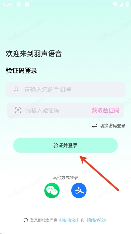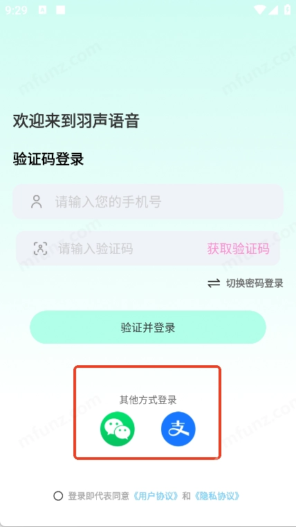 1、打开羽声语音点击同意并登录
