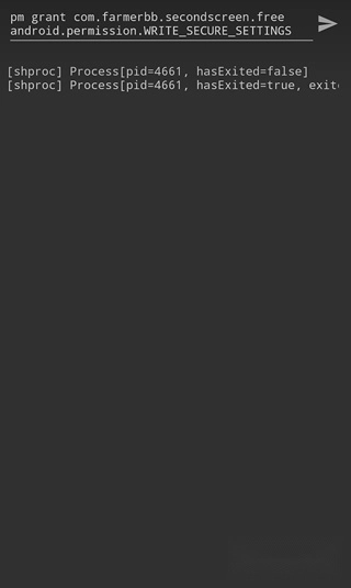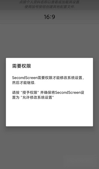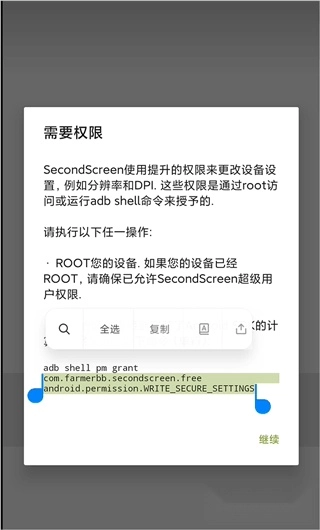 3、上面工作就绪后我们就可在手机上打开SecondScreen,它会提示需要权限,这里不要先关闭弹窗,先把弹窗中的三行shell命令复制下来