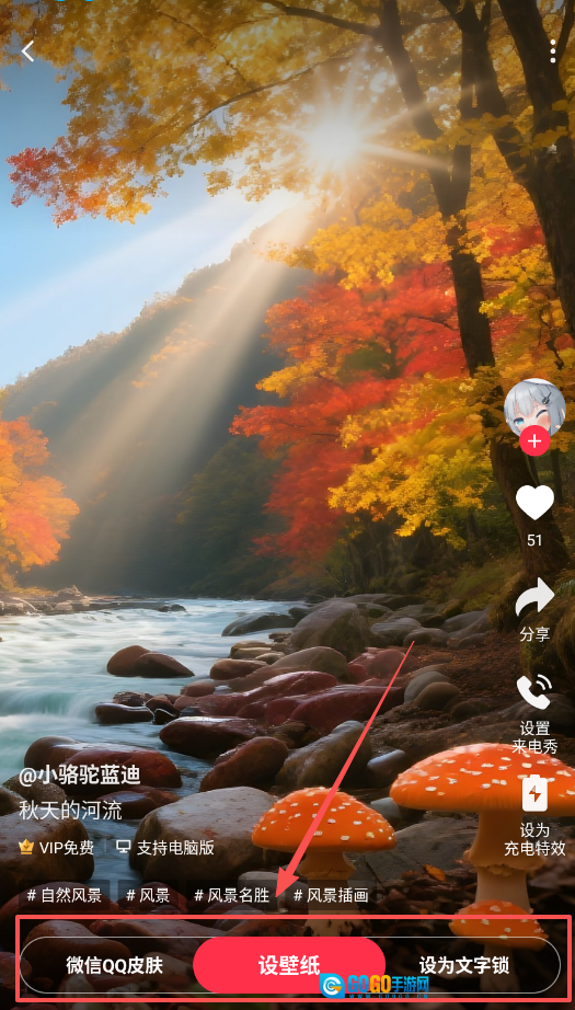 当遇到心仪的壁纸(比如秋天的河流这类),可以将其设置成手机壁纸、来电秀或充电特效,电脑端用户还能同步使用同款壁纸。