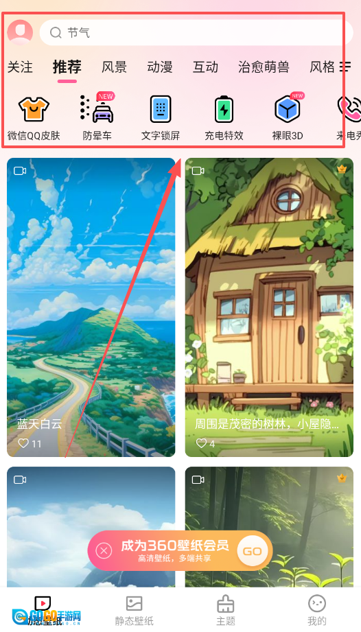 2、在节气栏目里,你可以选择关注、推荐或风格等标签,像蓝天白云这类壁纸就能通过这种方式找到;另外,会员还能免费使用防晕车、充电特效等特色功能。