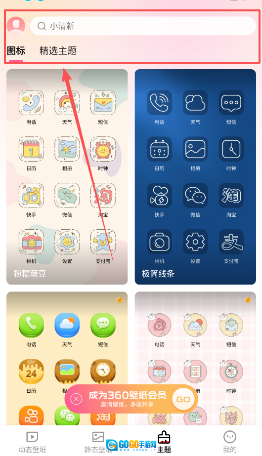 3、更换图标时,先进入精选主题页面,浏览粉桶萌豆、极简线条等不同风格,然后挑选电话、日历等应用对应的图标套装。