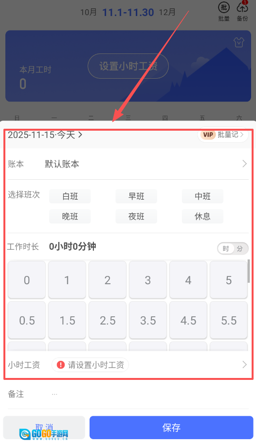 在记工时界面,你能看到一目了然的日历视图,点击选择合适的班次(如白班或晚班),最后记得填写备注并保存记录。