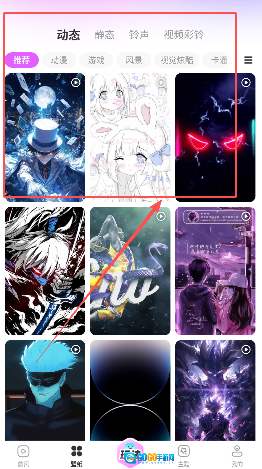 进入壁纸专区后,你会看到动态、静态、铃声等多种分类,推荐、动漫、游戏等标签也十分醒目,操作便捷又快速。
