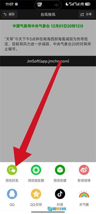 4、打开分享选项菜单后,选择微信好友这一选项,就能把台风快讯的内容分享至微信。