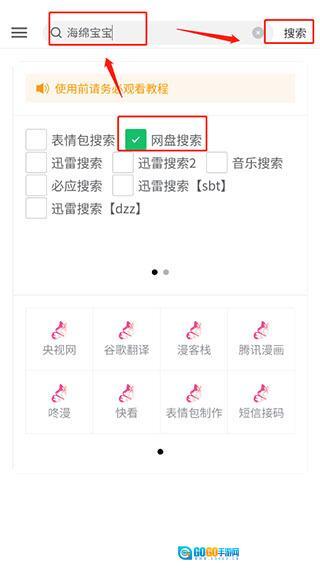 2、在搜索之前需要勾选相应的资源分类,比如网盘资源,之后输入关键词