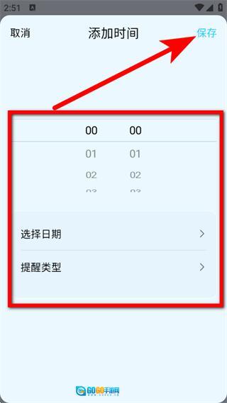 4、在添加时间页面,设置提醒的时间、日期、类型等信息,点击保存,完成提醒设置。