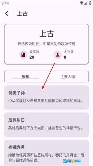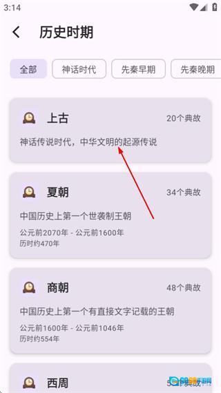 2、在历史时期页面,点击上古分类,可进入上古时期的典故列表页面。