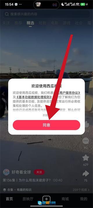 1、打开西瓜视频,弹出协议弹窗后,点击同意,进入首页。
