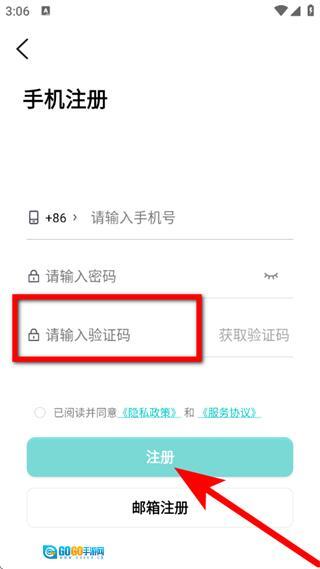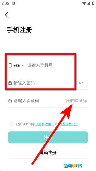 3、在手机注册页面,输入手机号和密码,点击获取验证码。