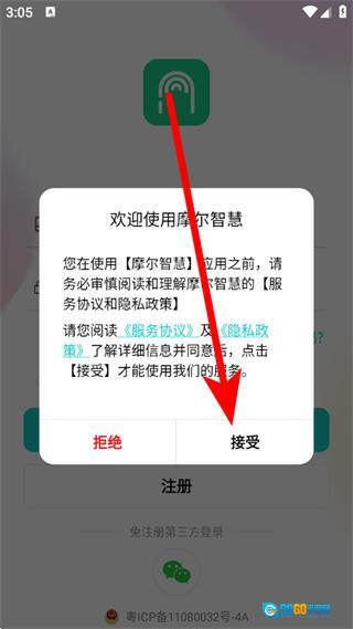 1、打开摩尔智慧,在欢迎使用摩尔智慧弹窗,点击接受。