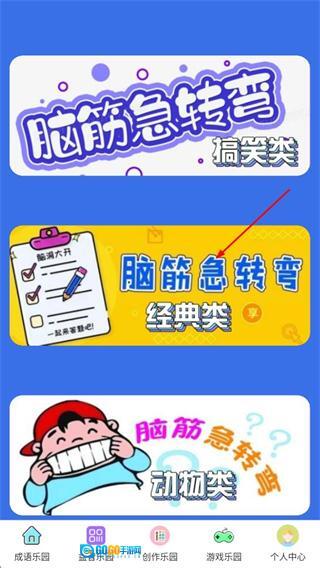 2、在益智乐园页面,找到并点击脑筋急转弯经典类选项,即可进入急转弯乐园页面。