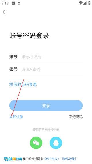 3、在账号密码登录页面,点击立即注册选项,可进入输入手机号的注册页面。