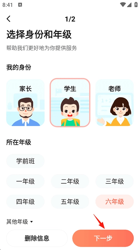 3、在下方选择您想要修改的年级,身份信息也可一并调整,之后点击“下一步”按钮。