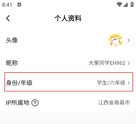 1、启动作业帮口算应用,点击“我的”,再点击昵称下方显示的年级|身份区域,进入个人资料页面。