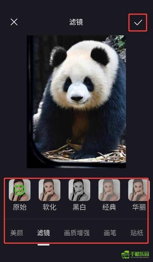 4、完成编辑后点击右上角"√"保存图片,支持选择画质等级(普通/高清/原图)导出。