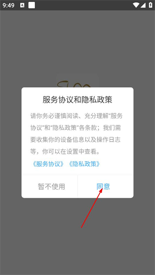 1、在弹出的服务协议与隐私政策窗口中,点击同意按钮,即可进入登录界面。