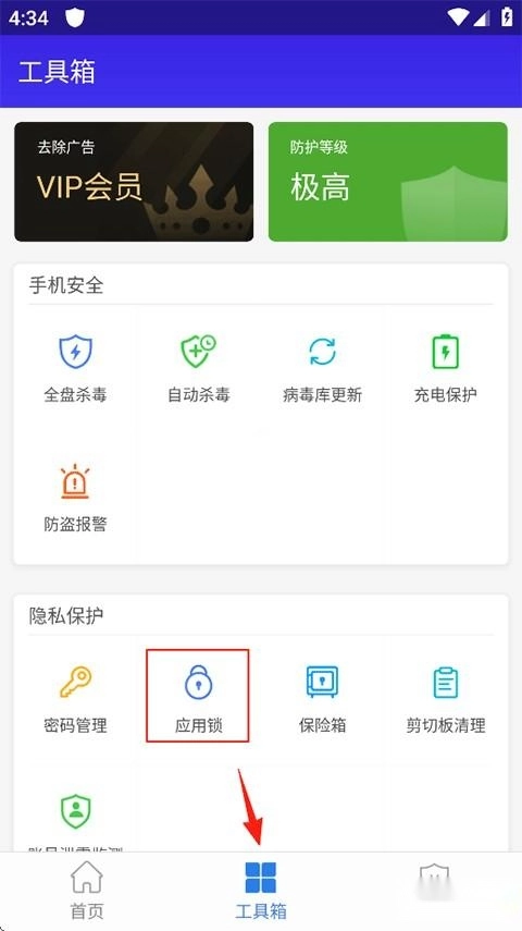 1、启动猎豹安全大师应用,进入后点击工具箱,接着在工具箱里找到隐私保护选项并点击,最后选择应用锁功能。