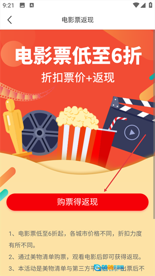 3、进入【电影票返现】页面后,找到并点击页面上的【购票得返现】按钮。