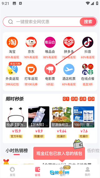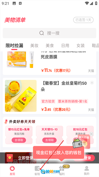 1、点击底部【省钱】选项,进入对应功能页面。