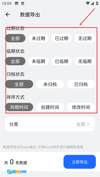 3、可根据实际需求设置过期状态、临期状态等筛选条件,以此完成导出范围的配置工作。