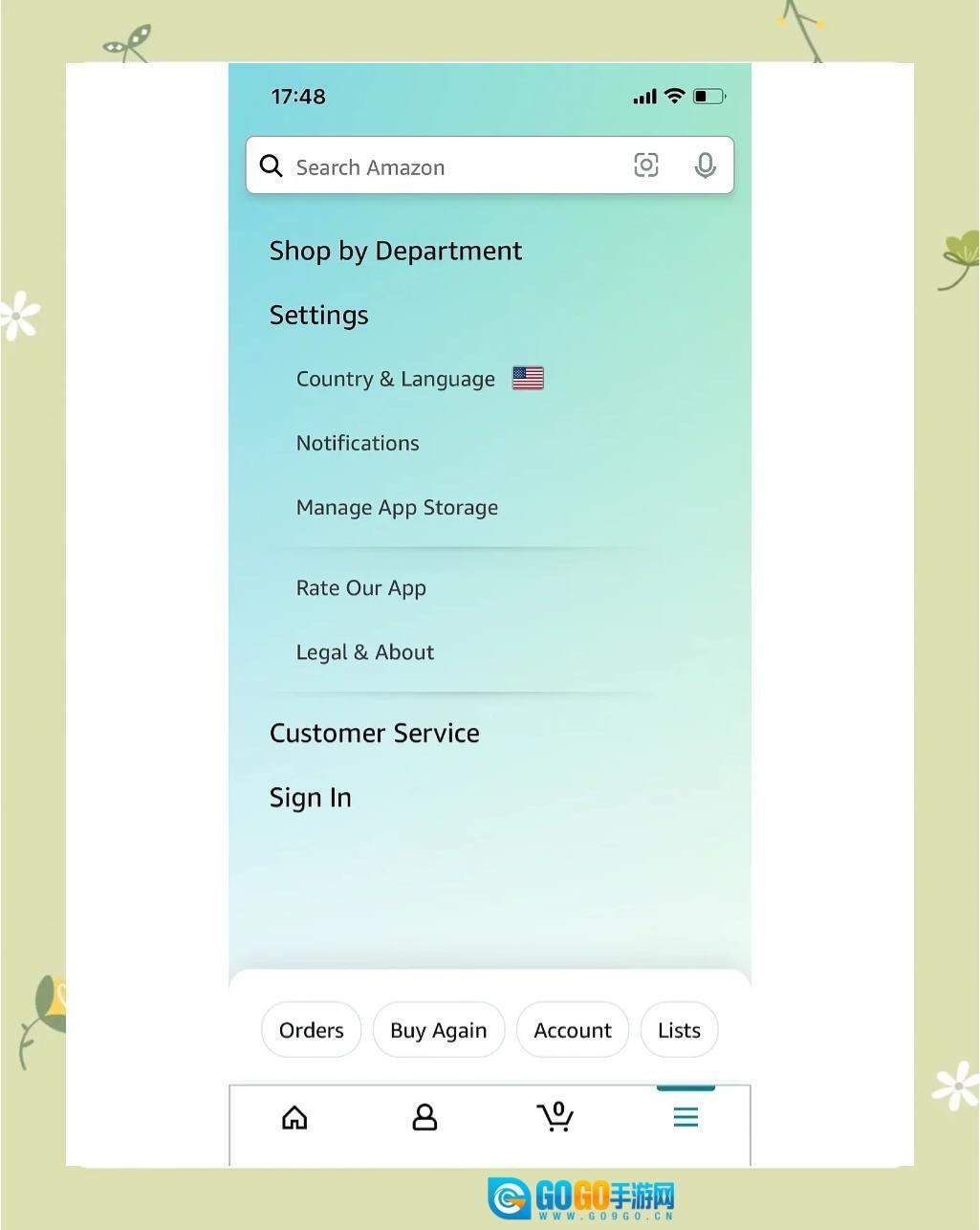 打开亚马逊App,点击首页左上角菜单图标,滑动至底部找到“国家/地区与语言”选项并进入设置界面。