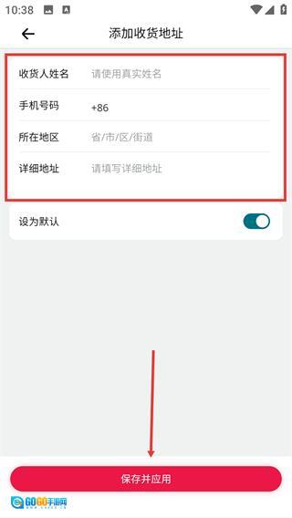 4、进入【添加收货地址】页面,填写【收货人姓名】【手机号码】等信息后,点击【保存并应用】完成地址添加。
