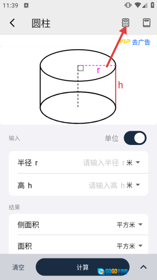 2、在圆柱计算页,点击右上角带键盘图标的按钮,可进行数据输入相关操作。