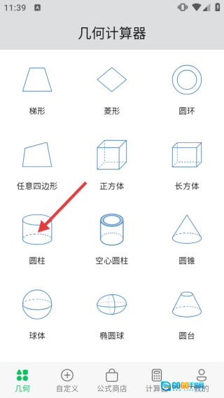 1、打开几何计算器软件,在几何界面选【圆柱】图标,进入圆柱计算页面。
