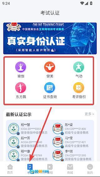 3、便捷在线考试认证:支持各类健身相关资质认证考试,在家就能轻松参与,成绩和证书都能在线查询。
