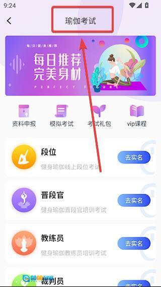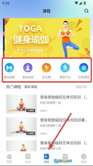 2、【考试】模块可查看各类不同的考试类型,点击对应的考试类型即可展开更多选择项,这里以瑜伽考试为例进行说明。