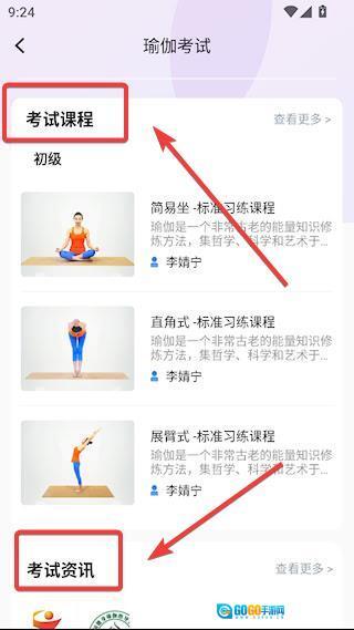 3、在瑜伽考试界面下拉,还提供了丰富的专业课程一级考试资讯