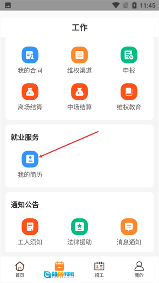 2、进入工作页面后,找到“就业服务”板块,点击其中的【我的简历】选项。