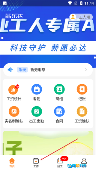 1、点击底部的【工作】按钮,进入工作功能页面。