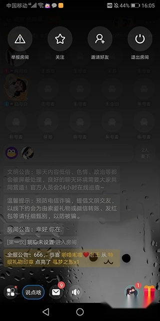 互动礼物功能:在房间内点击发言者头像查看详情,支持赠送虚拟礼物、表达好感、发起游戏互动及进行用户反馈等操作。