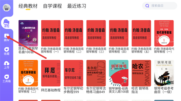 1、在应用左侧的导航栏中点击【曲库】选项,进入曲库页面后,就能浏览到各类钢琴教材以及曲目资源。
